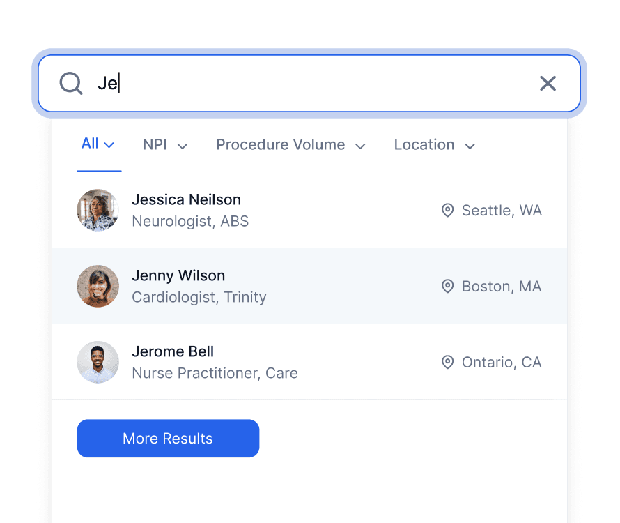 Start with our AI-powered search engine. Find any healthcare professional by name, NPI, specialty, procedure volume, prescribing patterns, or geographic location.