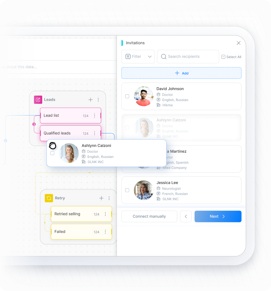 Build dynamic outreach lists, export to your CRM or email tool, and launch omnichannel campaigns. G LNK’s AI recommends the next best touch and highlights signals of readiness to engage.