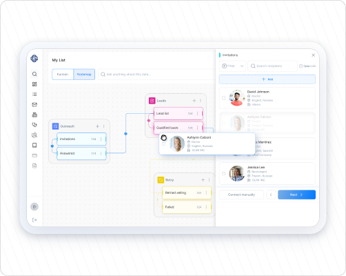 Get complete 360° context for each contact — what they prescribe, where they work, who they collaborate with — all enriched by real-world activity data.